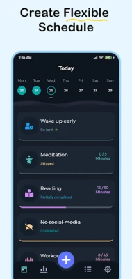Aplikace Habit360 se dokonale přizpůsobí vašemu rytmu. Podporuje čtyři typy návyků: denní úkoly, které můžete opakovat každý den nebo ve vybrané dny v týdnu; týdenní aktivity s nastaveným počtem opakování bez nutnosti specifikace konkrétních dnů; měsíční cíle s podobným principem; a jednorázové, neopakovatelné události pro specifické datum. Pro ještě lepší organizaci si můžete návyky seskupit podle denní doby – ráno, odpoledne, večer nebo kdykoli. S více než 100 předpřipravenými návyky, včetně těch, které vám pomohou zbavit se zlozvyků jako je kouření nebo nezdravé stravování, začnete okamžitě.