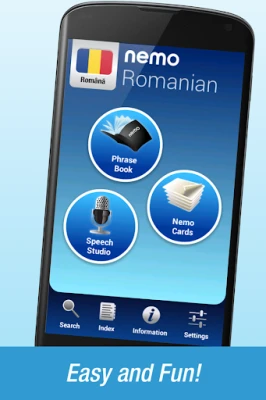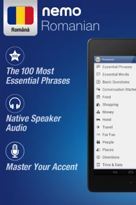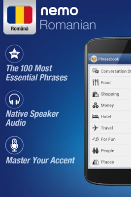 S aplikací Nemo začnete okamžitě a s jistotou mluvit nejužitečnější rumunská slova. Tato celosvětově oblíbená aplikace s miliony stažení je nyní dostupná pro Android telefony a tablety.