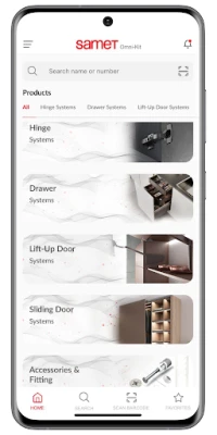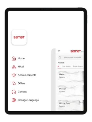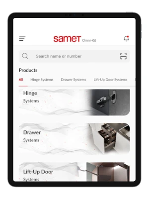 SAMET Omni-Kit Mobile Application je výsledkem našeho závazku k neustálým inovacím, digitální transformaci a především k hluboké spokojenosti našich zákazníků. S touto aplikací posouváme hranice toho, jak můžete intergovat s produkty SAMET, a zajišťujeme, že vaše zkušenosti budou vždy efektivní, informativní a bezproblémové. Objevte chytřejší způsob práce s nábytkovým kováním.